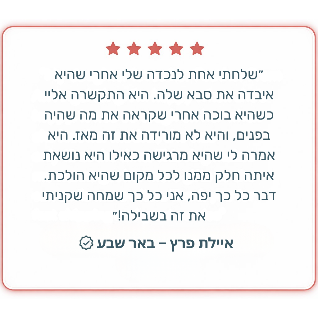 ״קניתי אחת לעצמי ואחת לאחותי. חרוטים בפנים המילים אמא ואבא. אהבתי שהיא מתכווננת, כך שלא צריך להתלבט לגבי המידה. קיבלתי עליה המון מחמאות״