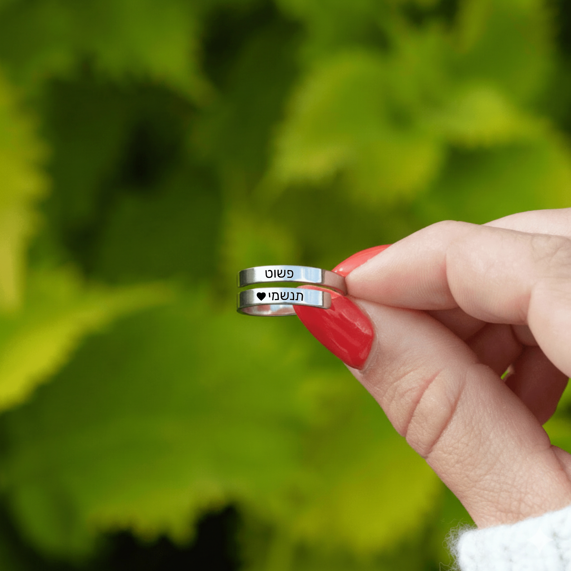 מידה אחת שמתאימה לכולן: עיצוב מתכוונן לחלוטין מאפשר לענוד את הטבעת מבלי לדאוג אם היא תתאים. זה גם מאפשר לקנות כמתנה בלי צורך למצוא מידה מתאימה.